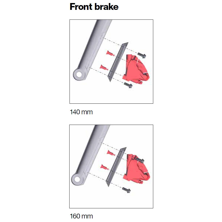 Flat Mount disc brake adapter for the installation of calipers for discs with 140 and 160 mm diameter. Due to the eccentric mounting possibility of the brake caliper on the adapter, the adapter can be displaced by 10mm from the center. This results in an adjustment range of 20mm and the adapter can be used variably for 140 or 160mm (see image 3).