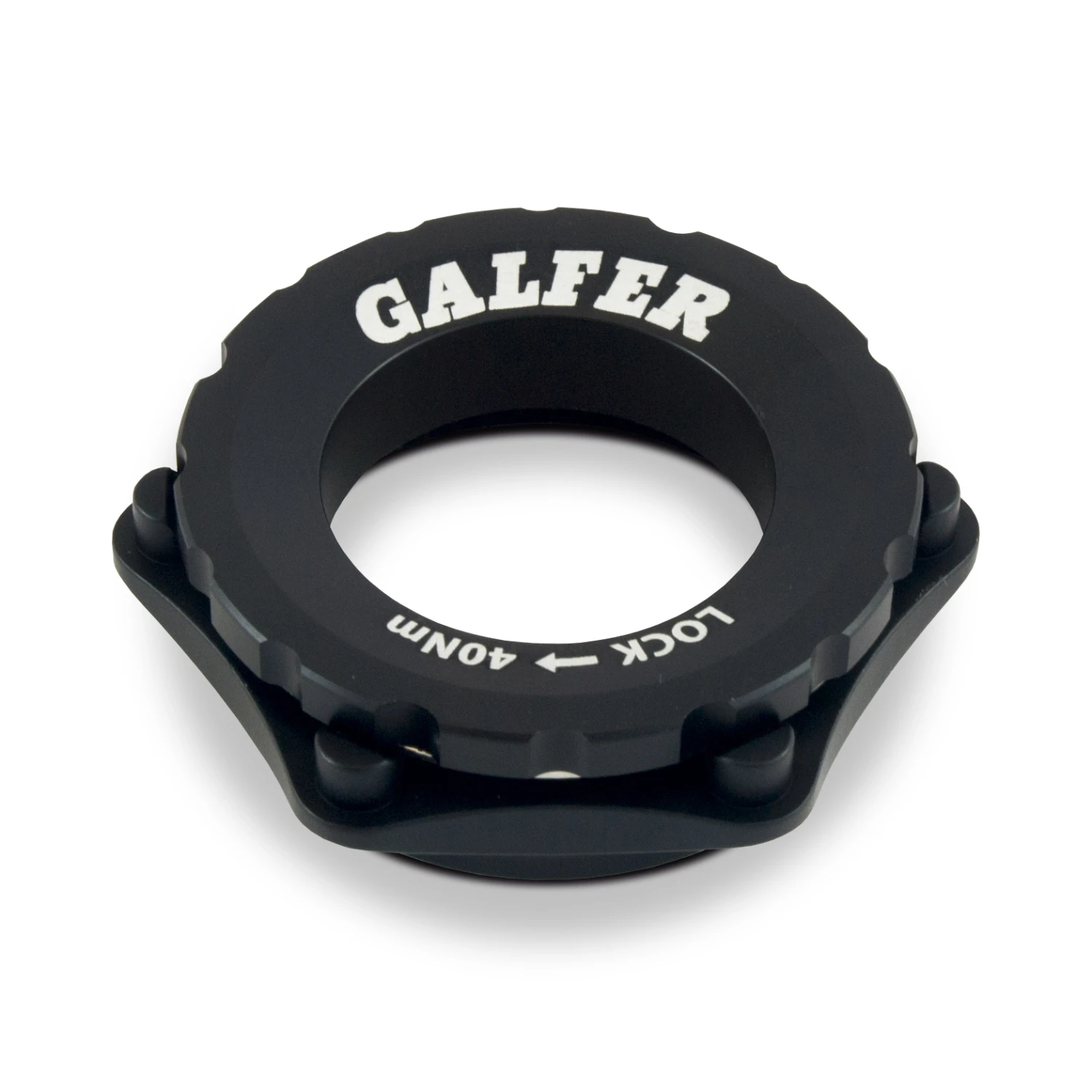 The adapter allows installing a 6-bolt Galfer Wave rotor on a Center Lock brake disc mount. It features two mechanical parts made of black anodized aluminium and a metal washer to fix the disc.