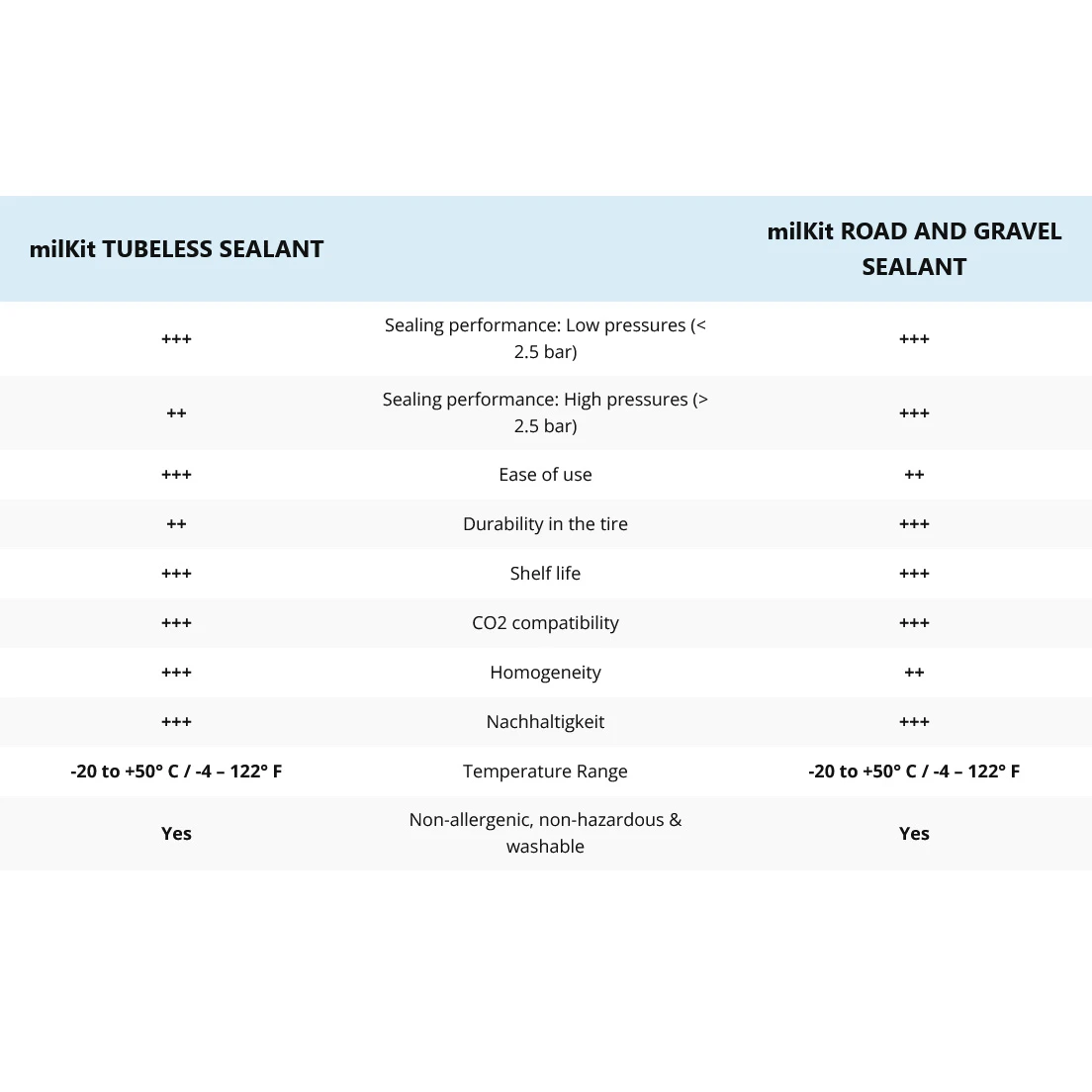 The Swiss manufacturer milKit sets the bar high in terms of sealing milk: A mixture that is always homogeneous, extremely temperature stable and seals cracks and holes up to 6 mm – completely without aggressive ingredients. Even after long periods of use, it does not clump, but dries out evenly. For better sealability under high pressure milKit uses microfibers – the sealing milk is thus particularly predestined for use in road as well as gravel tubeless tires.