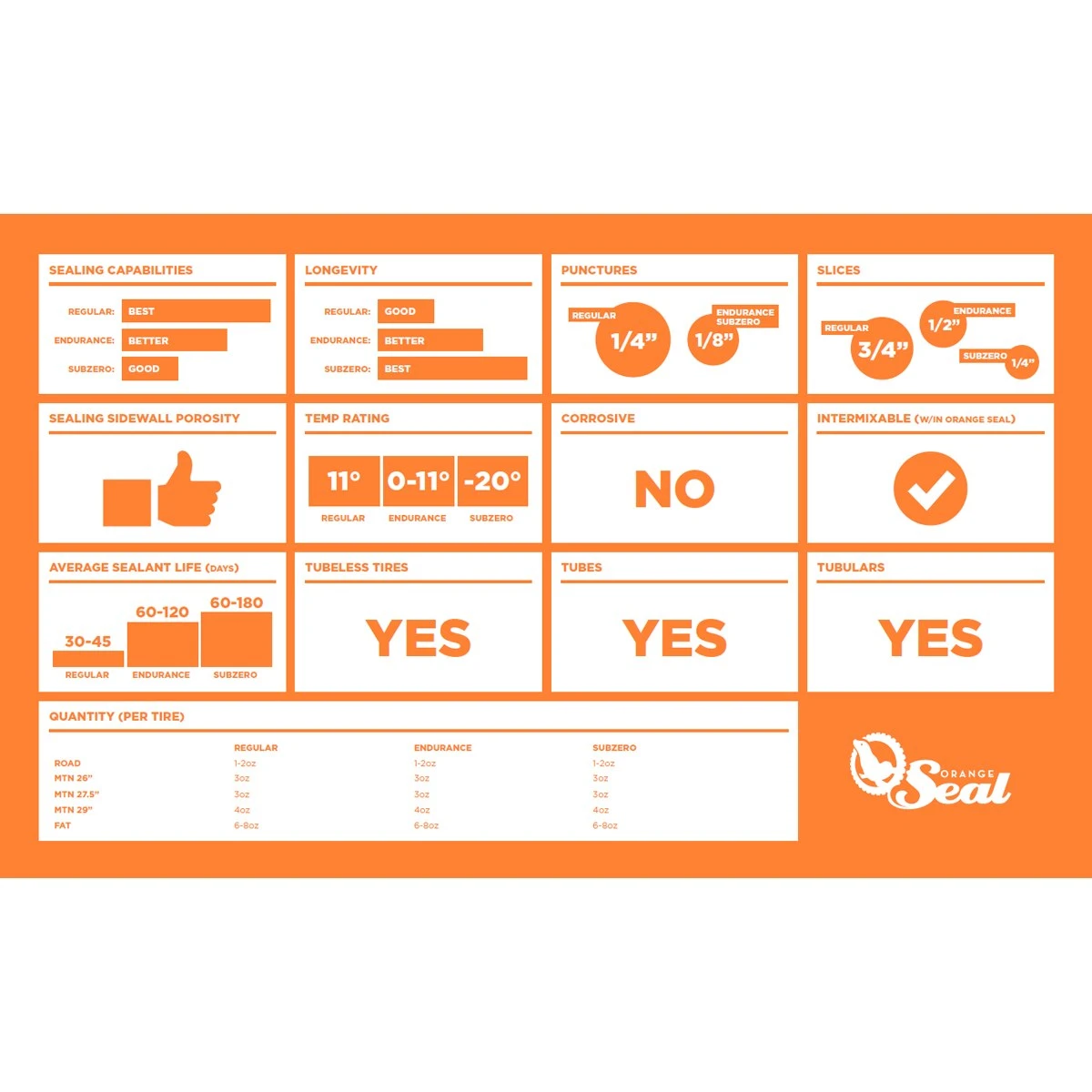 ORANGE SEAL Tubeless Sealant’s formula provides the best tire sealing capabilities. It is a sealing milk based on natural latex with particles of different sizes. Thus, it not only seals reliably, but is also environmentally friendly. ORANGE SEAL Subzero Tubeless Sealant is proven to seal large punctures up to 1/8″ (3.2mm).
