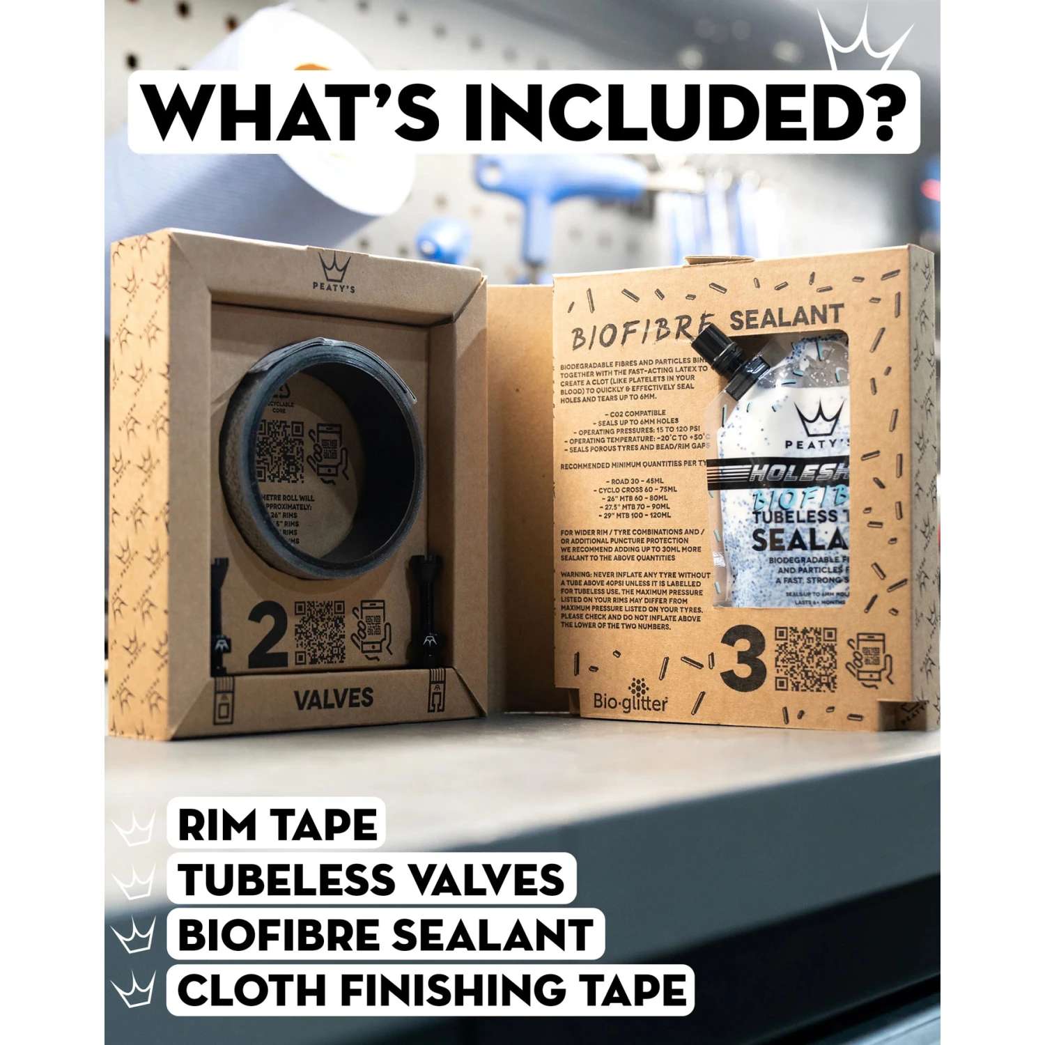 Peatyβs Tubeless Conversion Kit includes everything you need to run a fully optimised tubeless setup β Peatyβs Rim Tape, MK2 Tubeless Valves and holeshot Sealant. If you value more time spent on the bike and less time fixing punctures, this is the perfect set up.