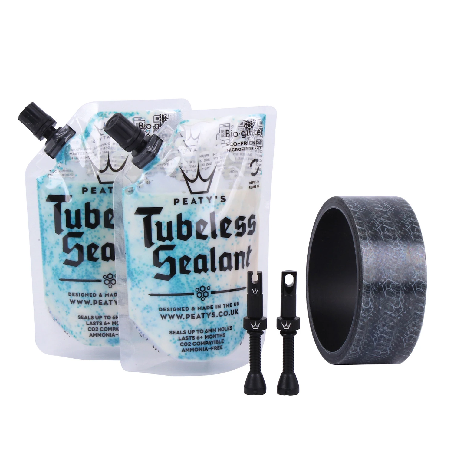 Peaty’s Tubeless Conversion Kit includes everything you need to run a fully optimised tubeless setup – Peaty’s RimJob Rim Tape, Tubeless Valves and Sealant. If you value more time spent on the bike and less time fixing punctures, this is the perfect set up. Not just a few bits thrown carelessly in a bag! Peaty’s Tubeless Conversion kits are beautifully laid out with easy to follow setup instructions.