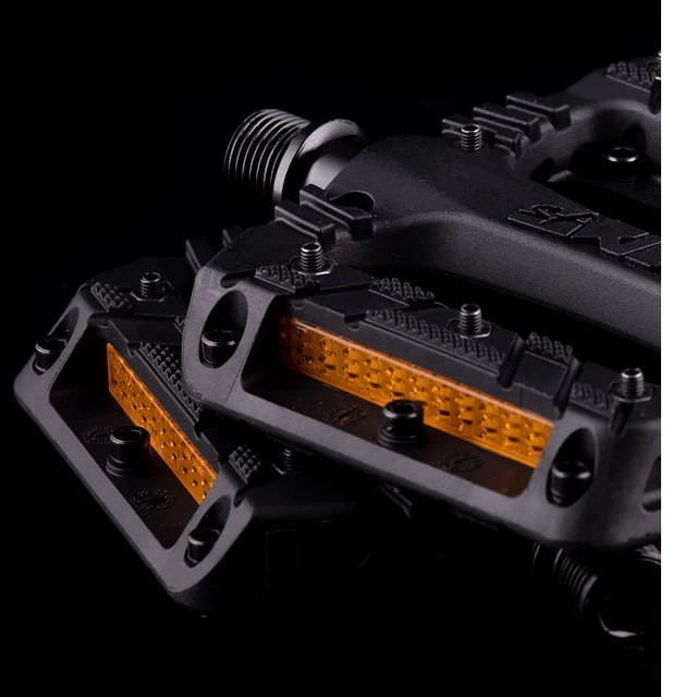 To increase visibility in traffic, at dusk or in bad weather, the pedals are equipped with replaceable reflectors. When the bike is used in the park, the reflectors can be removed with a flick of the wrist. The smooth rotation of the pedal body on the thermochemically hardened CrMo-axle is guaranteed by the sealed deep groove ball bearings and DU-bushings. Rubber lip seals protect the pedals from external influences such as wetness, dust & moisture.